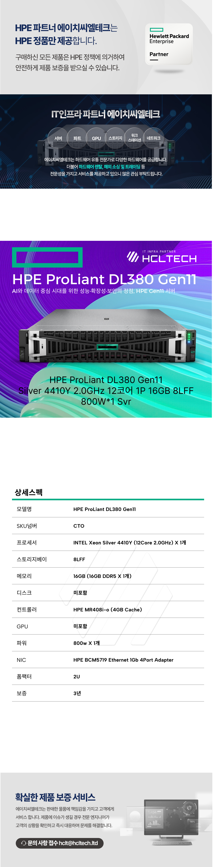 서버 HPE Gen11 DL380 G11 랙(RACK) 2U 1P(소켓) LFF(3.5인치) 8bay 신품